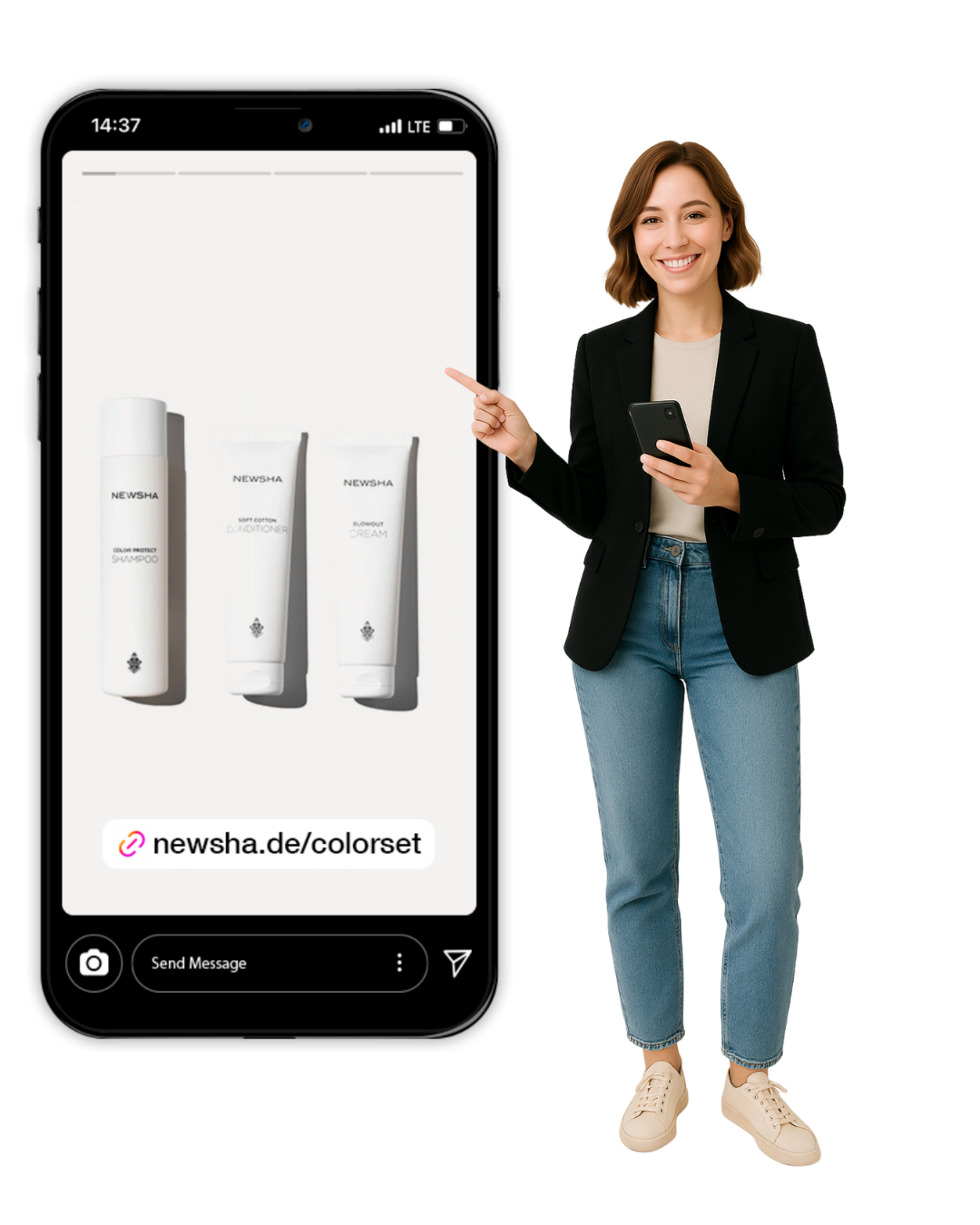 Sie präsentieren Produkte in einem thematischen Kontext – etwa als Lookbook, Kampagnen-Story oder Inspirationsseite – und führen mit einem Direktkauf-Link, wie der Cart-Permalink von Shopify oder einem Shoppable Link by MoSeven zum Abschluss.